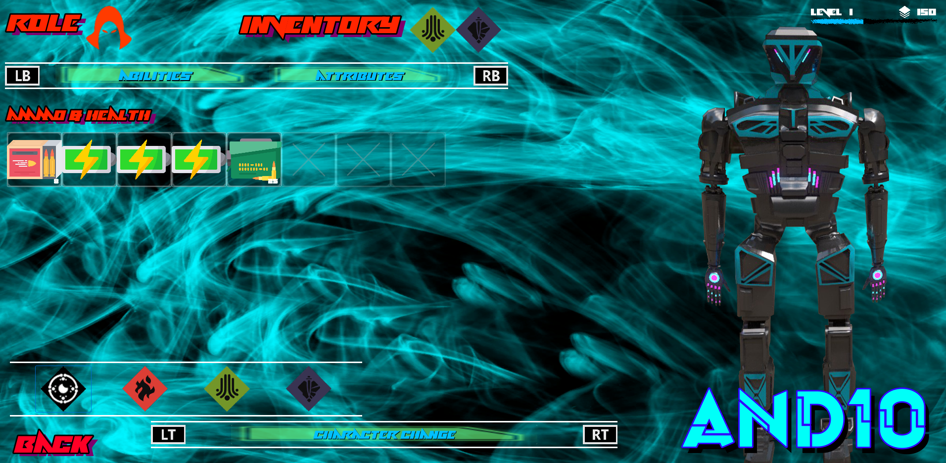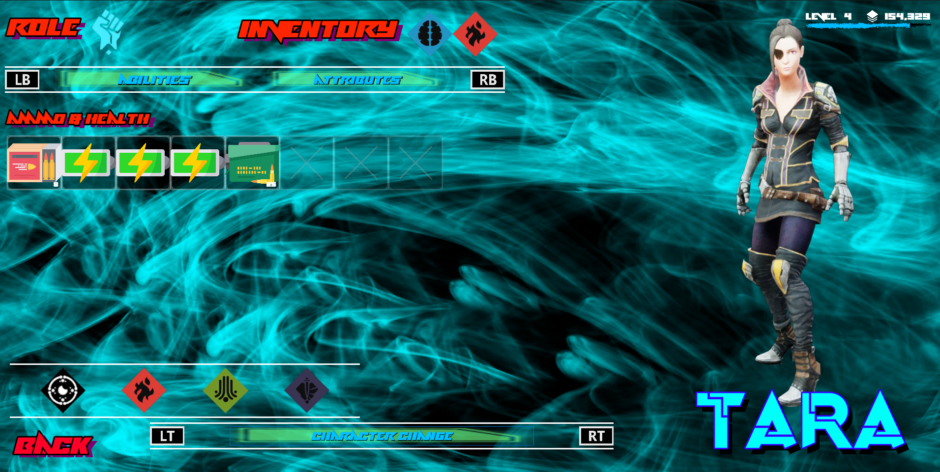 The UI design features abilities and attributes for the two different characters that are available from play start
